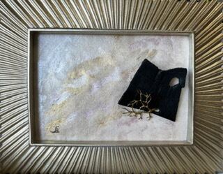 廃棄予定だったワニ革を活用し、手仕事でブローチに仕立てました。背景は和紙に岩絵具で着色し、自然な風合いを表現しています。